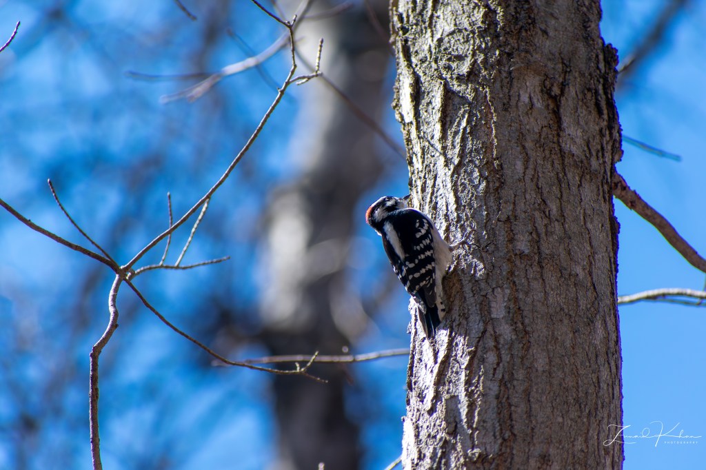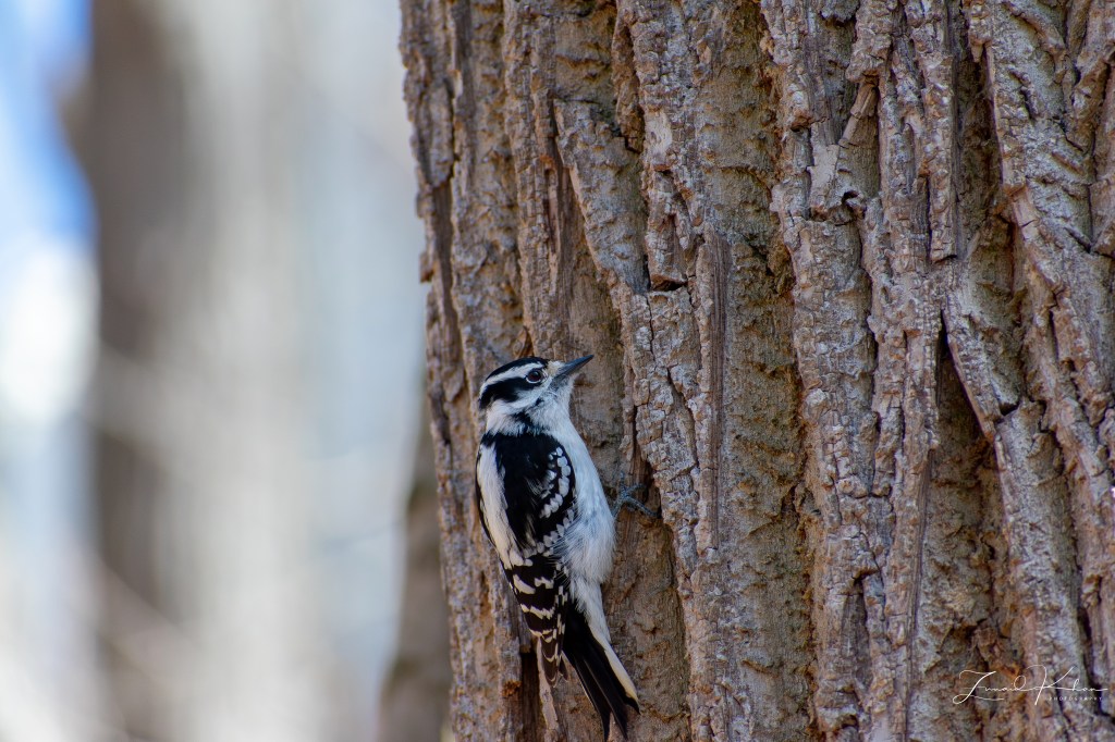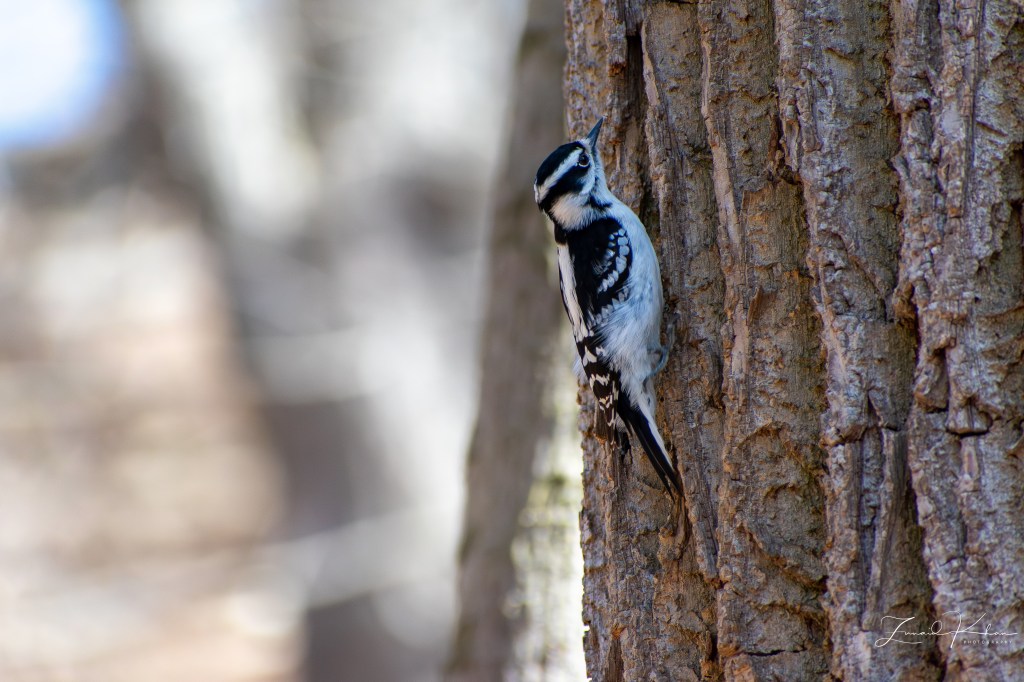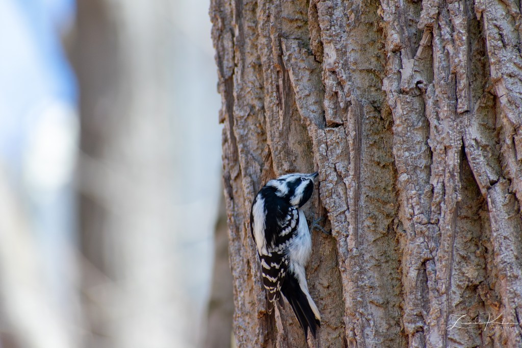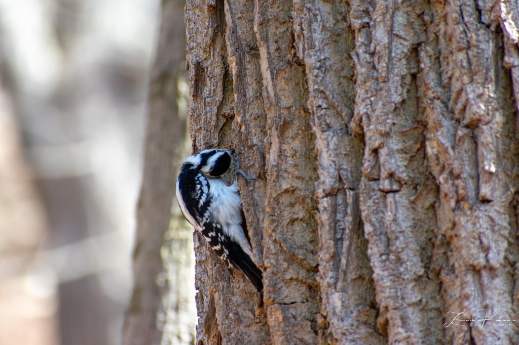 The bird featured in this post is the Downy Woodpecker. This bird is a year-round resident in this area and does not migrate. It is the smallest woodpecker in North America, with its length ranging between 14 and 18 cm. It tends to forage along the bark of trees in forested areas in search of insects. In urban environments, these birds do visit backyard feeders. When foraging, they can be quite acrobatic and, due to their size, are quite adept at balancing on tiny branches or slender plant galls.