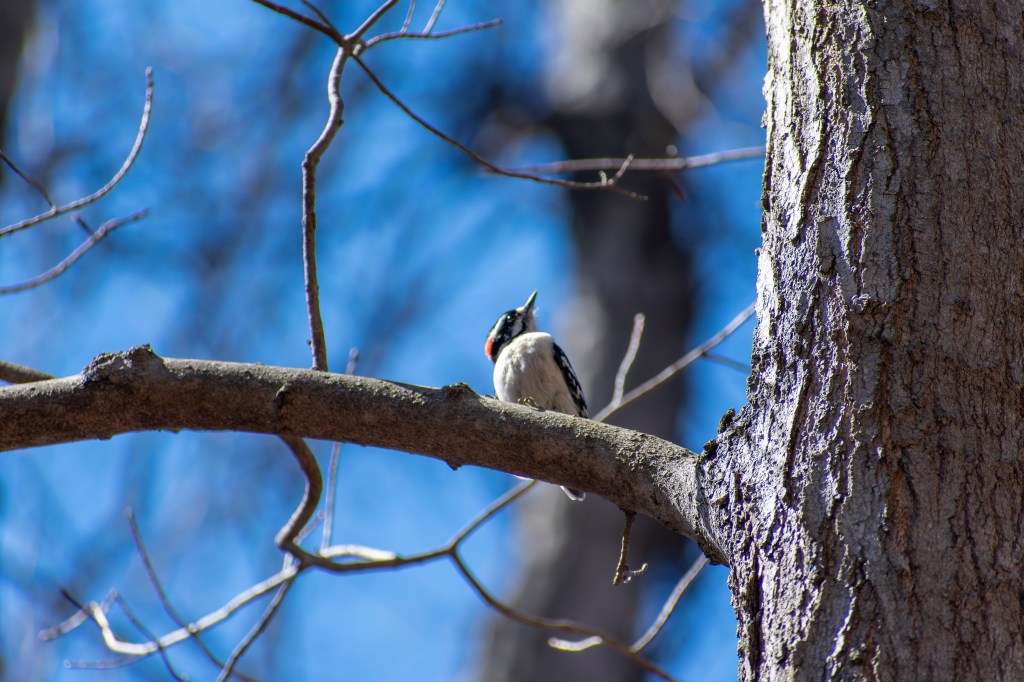 The photos below showcase a behaviour I observed while studying these birds foraging along tree bark, where they perform a twisting motion of their necks to create holes in the bark while foraging for insects. The bird in the photos is the female; the male has a red patch on the back of his head.